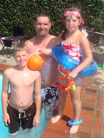 Kyle turned 12 & his mom had a Tiki Luau Birthday party. She had their backyard transformed to an Hawaiian island resort. The kids had so much fun in the pool & squirt guns. Serene & Brandon have a bar with all the fixings’ and put a flat screen out by the pool so the adults could watch the Lakers game. There was a lot of action having fun in the sun!! The music was great including Brandon’s band, he is such a Rocker Dad. Serene created the cutest cake & cup cakes. The kids did the limbo & a watermelon eating contest. Yes Serene & Brandon are expecting a girl.